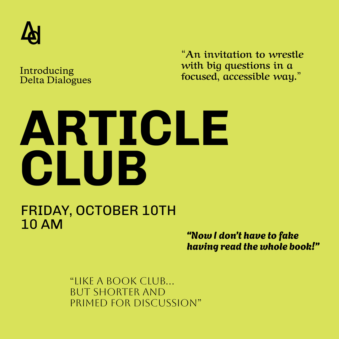 Unlike a traditional book club, each session will center on something shorter and more immediate—an article, an essay, a short story, even a treatise… and sometimes, a podcast. The format may vary, but the goal is always the same: to spark meaningful conversation over ideas that matter.